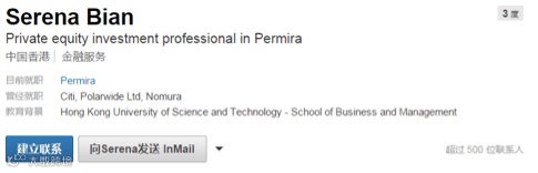 领英用户(LinkedIn Member)Serena Bian是一位投资专业人士,目前就职于香港Permira,曾就职于花旗银行。