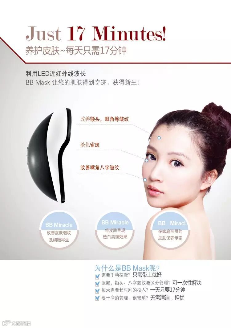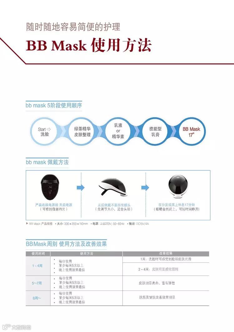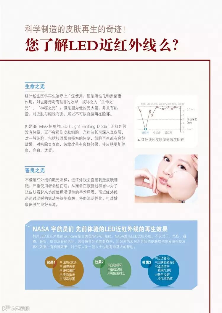 BB MASK 是韩国国内首个将纯正LED近红外光线引进美容产品领域,通过近红外光线来唤醒皮肤真皮层沉睡的细胞,是一款家用科技型护肤仪器。