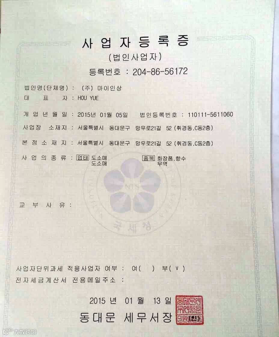 申明1:MY.印象工作室是在韩国正规注册的一家贸易公司,有韩国政府颁发事业公司登入证。