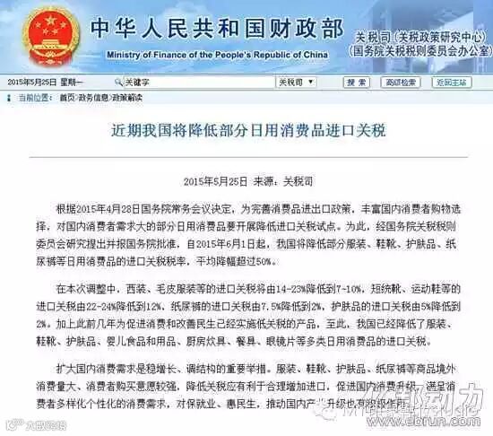 此次进口关税下调,是根据2015年4月28日国务院常务会议决定:“为完善消费品进出口政策,丰富国内消费者购物选择,对国内消费者需求大的部分日用消费品要开展降低进口关税试点。”
