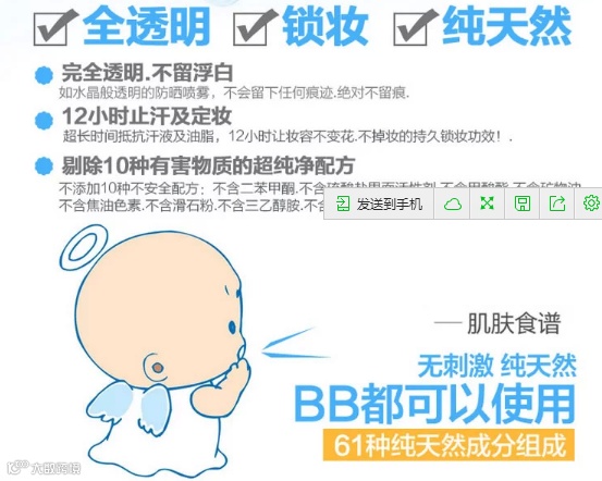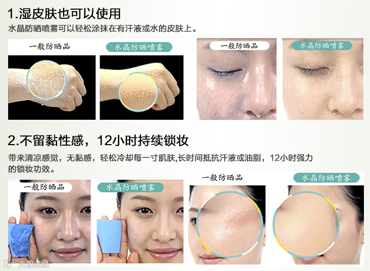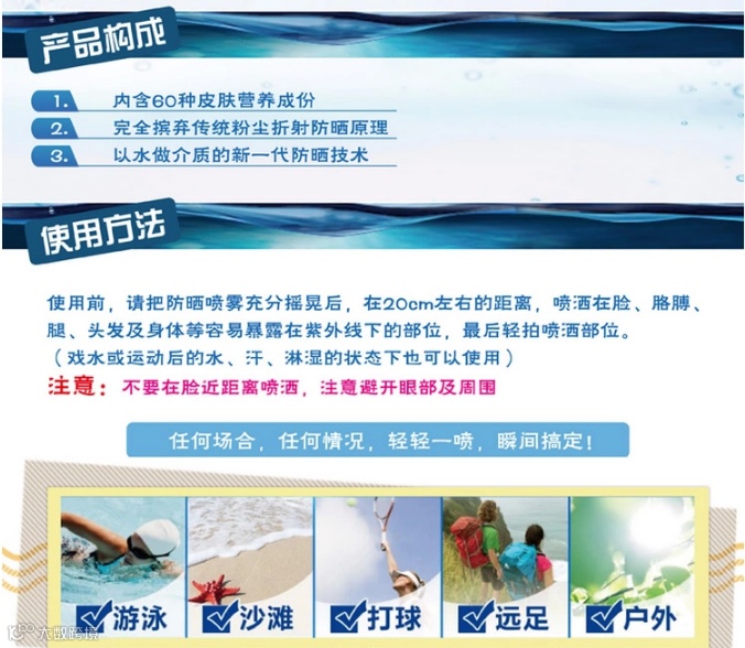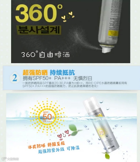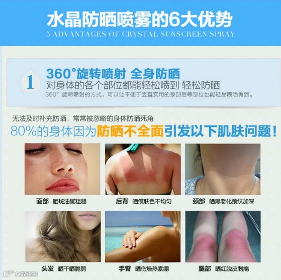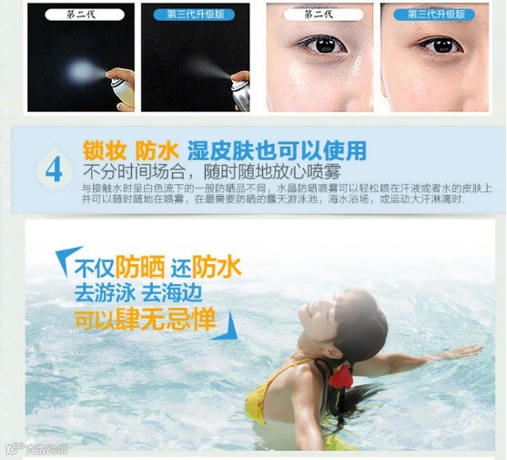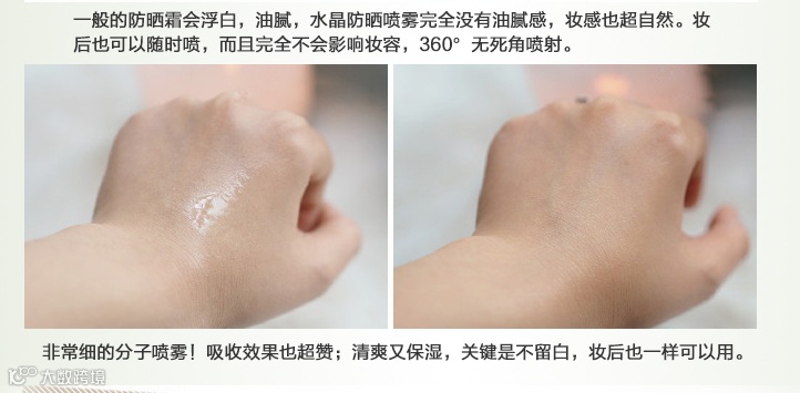 众所周知,对于防晒这个工作是最好一年四季都做的。那么对于我们化妆的女同志来说,擦30倍的防晒出门几个小时就失效了,这时候再拿出防晒来补妆那是不可能的。必然花妆。所以市面上层出不穷的各种防晒喷雾就面世了~不过我想大家都对这种东西感觉不太好,因为很容易粘腻和留白。反而也是化妆。所以大家这年头都学会用”气垫粉“来补妆。但是另个问题就来了,我们还是被晒黑了。。。OMG! 所以当我遇到这款防晒喷雾的时候简直感动哭了....首先是非常细的分子喷雾!非常!好!吸收!接下来是绝对不留白~不影响妆容的完整性并且可以保湿定妆!碉堡了好吗!接下来它还有镇定作用...夏天你晒得满脸通红可以镇定你的肌肤!我TM再也不怕长斑了~!ohyeah!最后它全身都可以用,并且SPF50+PA+++意味着它的防晒时长足达12小时!而且它不含有害物质...是孕妇都可