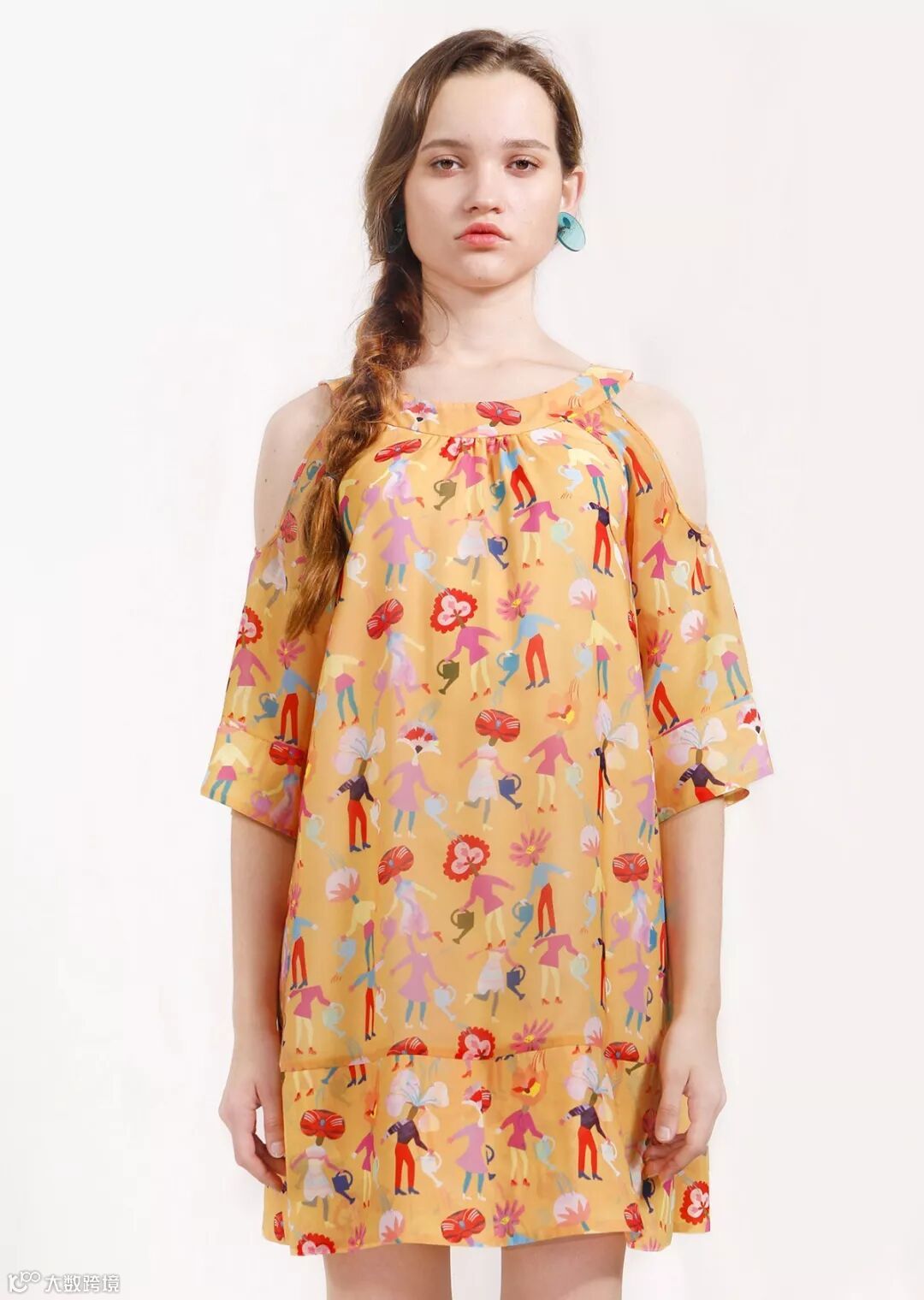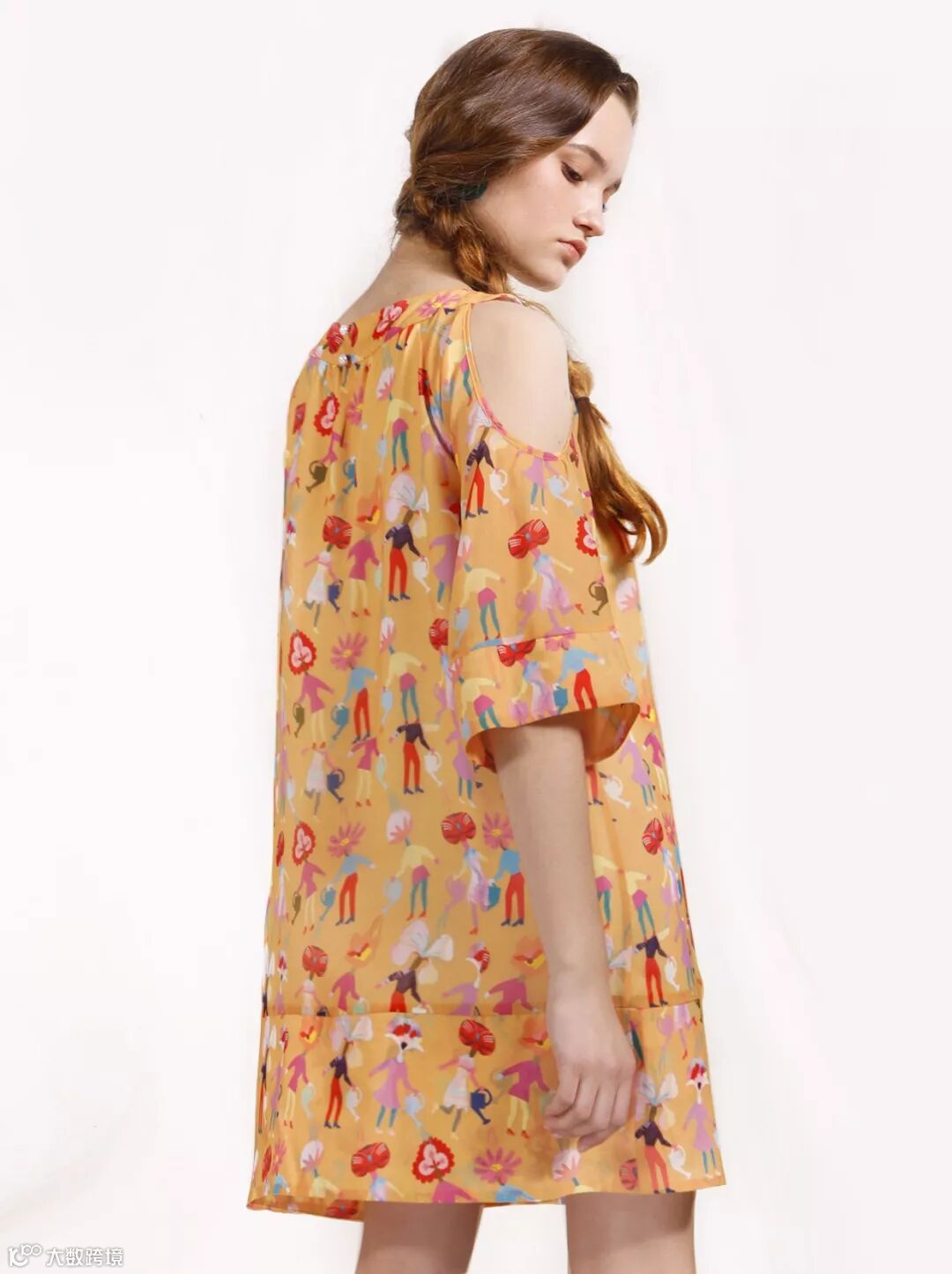 多彩园艺师图案印花连衣裙具有小露肩的俏皮