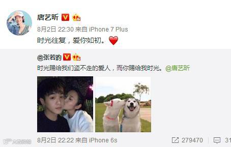 唐艺昕转发,然后回复“时光往复,爱你如初”。