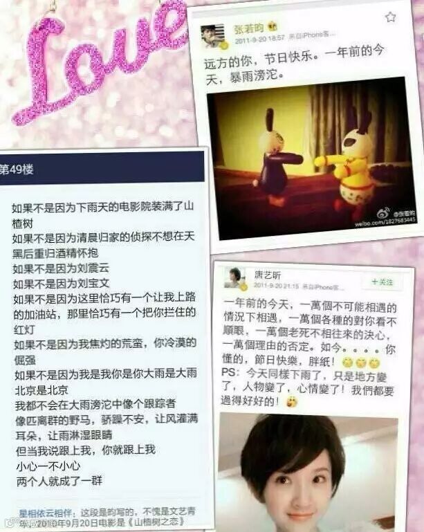 加上唐艺昕的微博,可以初步推测出,应该是下雨天,刚看完《山楂树之恋》的张若昀开车要去加油站,在红绿灯处,追尾或者擦到了唐艺昕的车,就这么认识了。