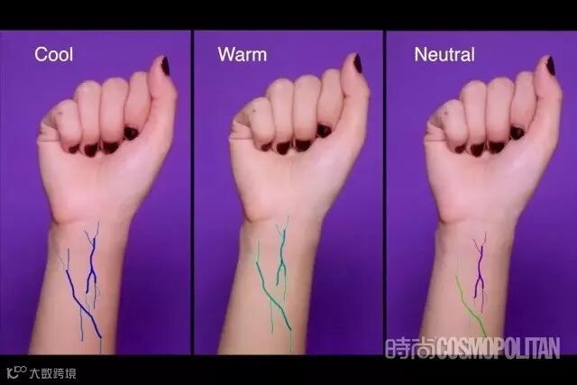 1 血管辨认法:如果你的血管蓝紫色偏多就是冷调,如果绿色偏多就是暖调,如果差不多,恭喜你是中性色调哦。