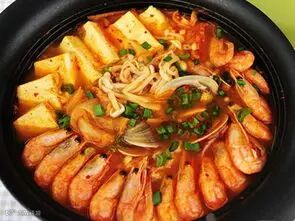 韩国甜辣酱,大酱,活虾,辣椒粉,蒜泥(3个),葱段(2段),土豆切片(1个)白玉的南豆腐切块(1块)海带,粉条,蘑菇撕片(平菇,金针菇都可以),西葫芦切片