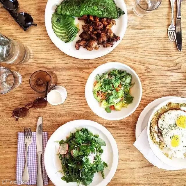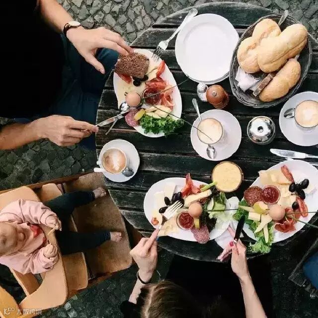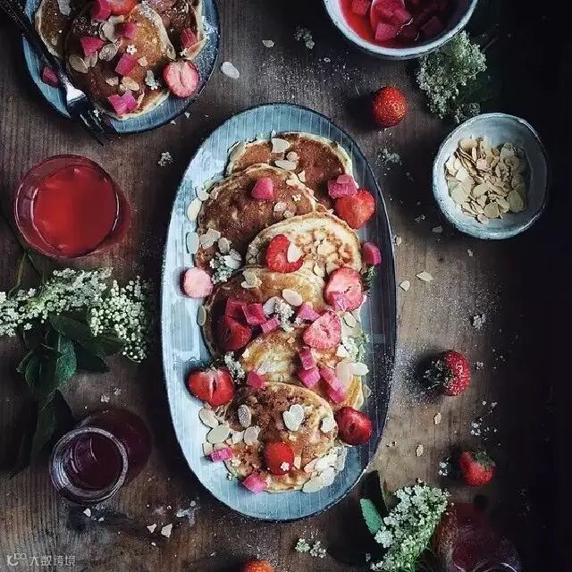 如果你尝试寻找了各种角度拍出来的感觉都不满意的话,那不妨直接将镜头垂直对准食物从上往下拍,有时候还可以让满桌的美食一起入镜。餐桌上的食器、装饰摆设甚至是用餐的人正伸向美食的手都可以让画面看起来更加富有意境,营造出一种动态美,让观者有种想要加入其中的冲动。