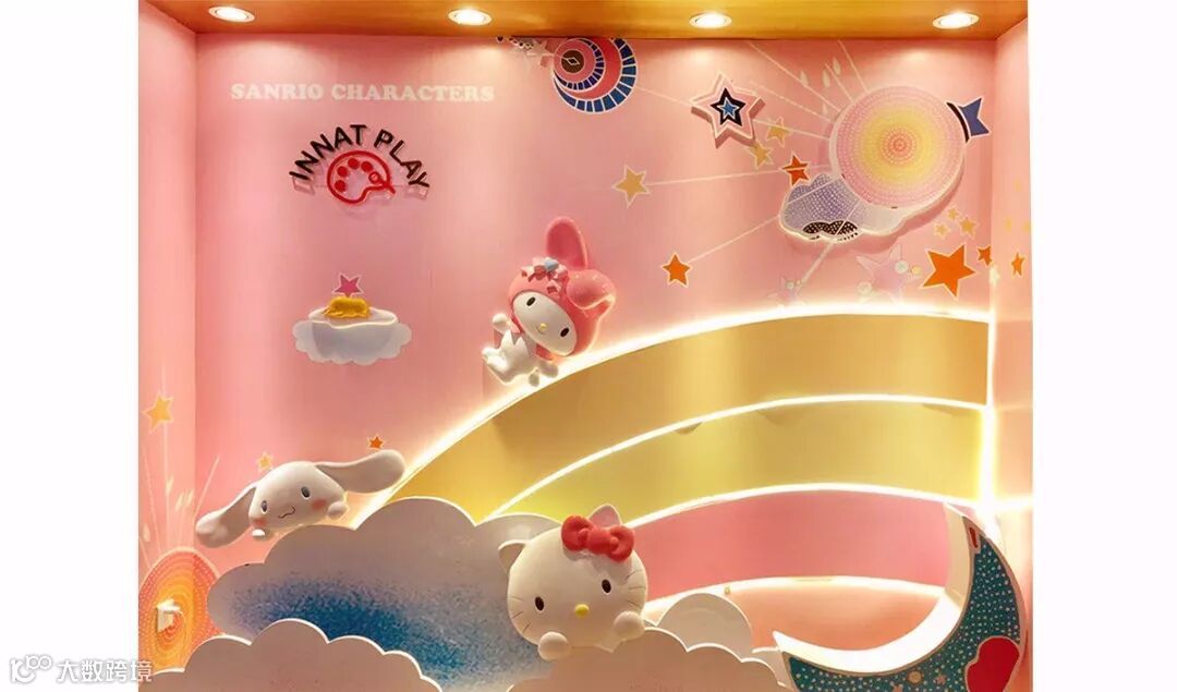Sanrio Characters 卡通人物造型自拍墙,多层次的彩虹云朵作为主要设计元素,仿佛置身云间花园任意穿梭。选择马卡龙颜色为其注入乐观阳光气息,打造专属 ni 个性的仙女造型。