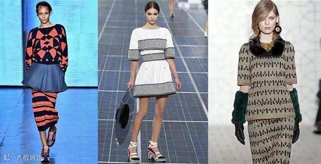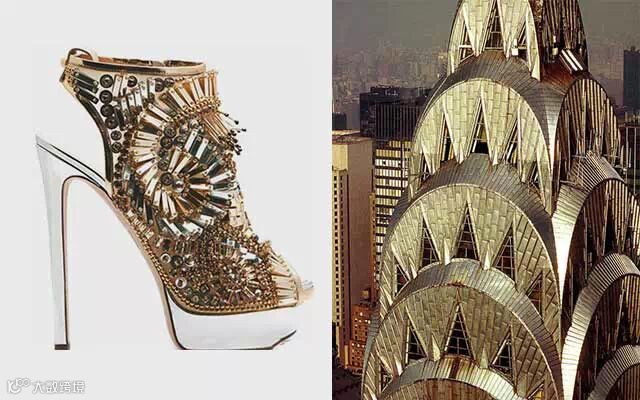 ^Art Deco遇到时装:时尚与艺术的相互渗透体现在各色T台秀场上。Art Deco这种常常被运用到建筑上的艺术风格,为设计师们在服装上大做文章也提供了广阔的空间。