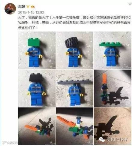 和孩子一起堆乐高,邓超也能享受其中,还创作出了自己的得意之作;