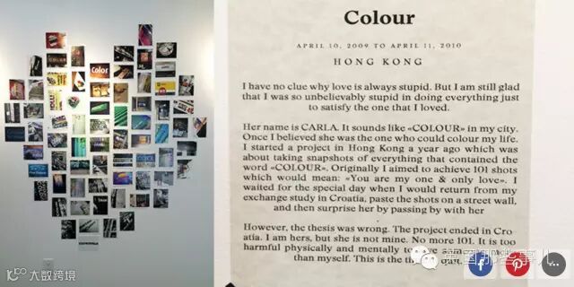 “爱情真的会让人变蠢。她叫CARLA,在我听起来她的名字就像是COLOR,因为也正是她让我的生活充满了色彩。我开始在香港拍下了任何包含着COLOR这个单词的地方,起初我想拍下101张,意味着你是我的唯一。我想把这些照片贴在一面墙上,然后装作不经意的带着她经过,给她一个惊喜。然而还没拍够这些照片,我们就分手了。”