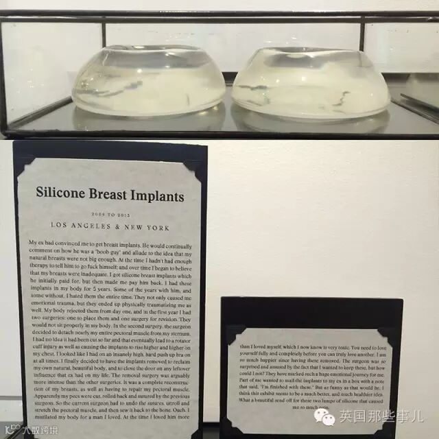 这是五年来让我误比后悔的一个决定,这对东西不仅让我承受身体上的痛苦,精神上更甚。手术中成熟的痛苦更不用说了,这一切只是因为我爱他胜过了爱自己。现在我明白了,你只有真正的爱自己,才会用正确的方式爱别人。为了懂得这个道理,我付出的代价太大了。而为了让你们能明白,用它来做展品再合适不过”。
