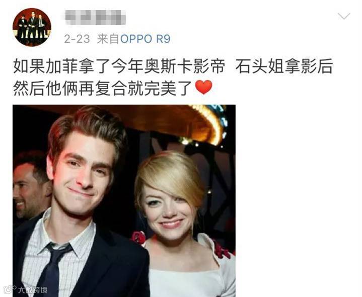 不同于其他情侣分手后撕逼导致事业下滑,他们反而事业步步上升。石头姐斩获金球奖最佳女主角时,台下的加菲激动地站起来为她鼓掌。