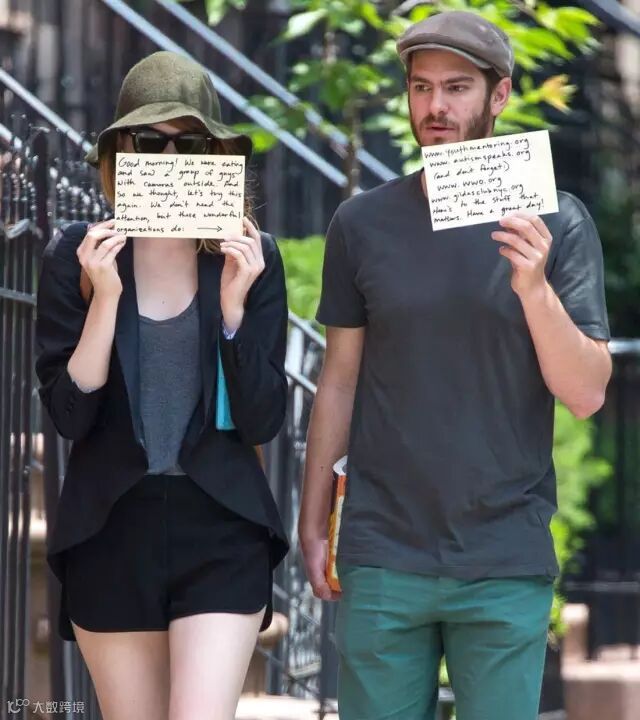 有一次,他们发现狗仔在门外“守株待兔”,二人就举着小牌子走了出来。石头的上面写着“我们在吃饭的时候发现有狗仔队在外面拍照,我们觉得我们不需要这么多关注,不如你们来关注些更有意义的吧”,加菲的牌子上面就写了一些与慈善有关的网站网址。