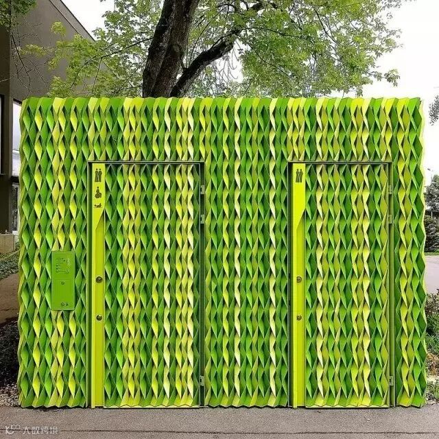 这个公厕是2011年Gramazio&Kohler专门为乌斯特市设计的,它的墙面由折迭的彩色铝条排布而成,不同的阳光位置和不同数量、厚度、色彩的铝条会碰撞出不同的视觉效果,当然和绿绿的它合照也一定会让你看起来嫩嫩的。