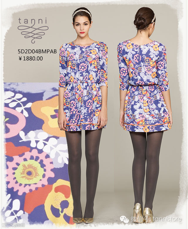 X版松紧收腰连衣裙。英国设计师设计的花卉图案,颜色鲜亮明快,极衬肤色,裙摆多条丝带环绕,轻盈活泼。