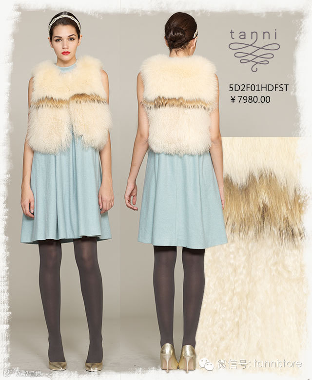 天蓝中长款连衣裙,外搭短款貉毛狐狸毛羊毛浅色拼接马甲,雍容华贵中彰显时尚前卫,怀揣慵懒的热情赴一场奢华盛宴。