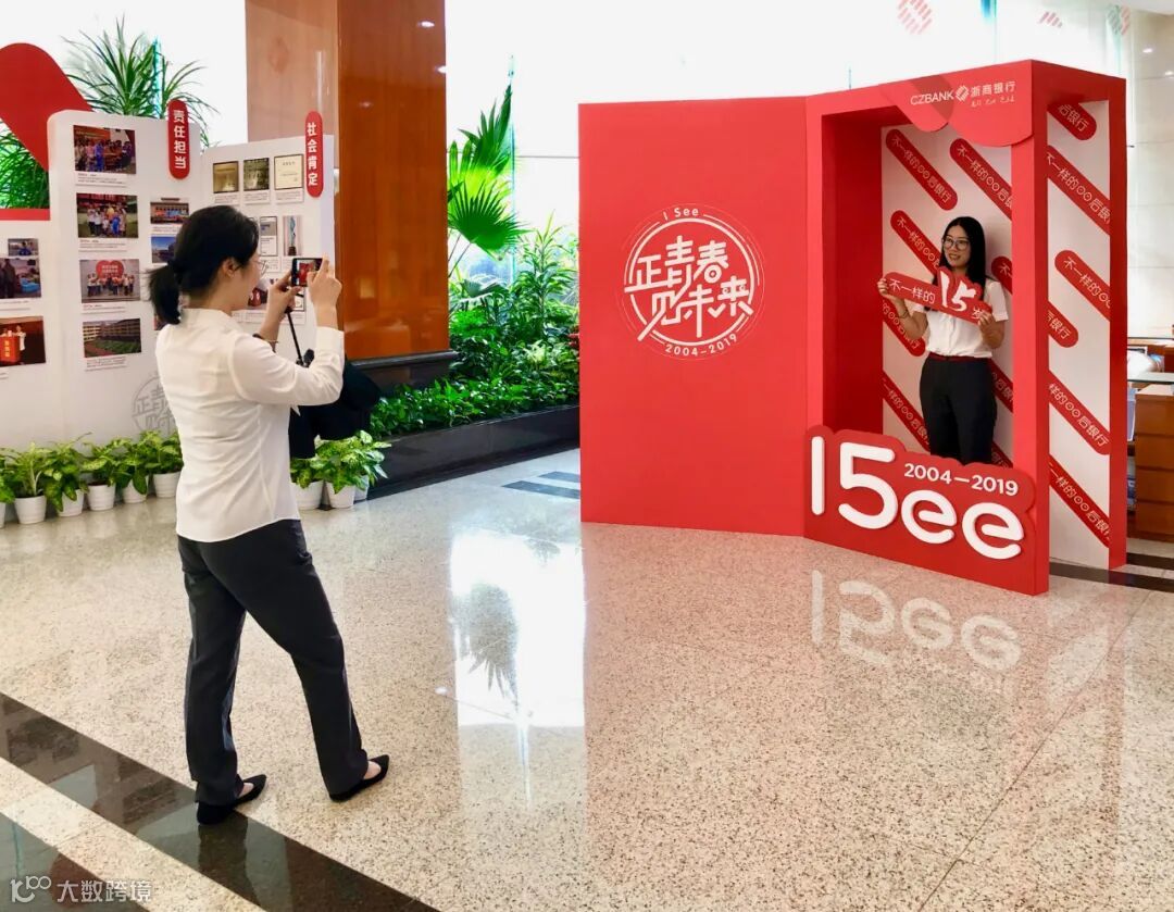 2.拍照纪念不一样的15岁,在总行设置拍照打卡区,员工互动,形成自传播效应。