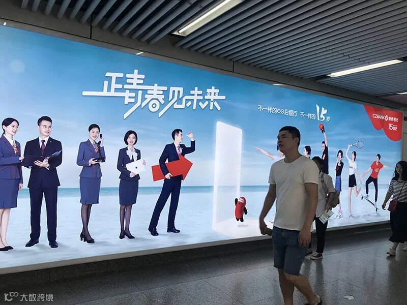 2.依托重点城市地铁,呈现活力与科技。以浙商银行年轻员工为模特,采用对比的画面呈现,一边穿着优雅正式的行服认真工作,另一边穿着行庆专属 T 恤衫休闲快乐,左右服饰不同,但一致体现浙商银行人的青春与活力。