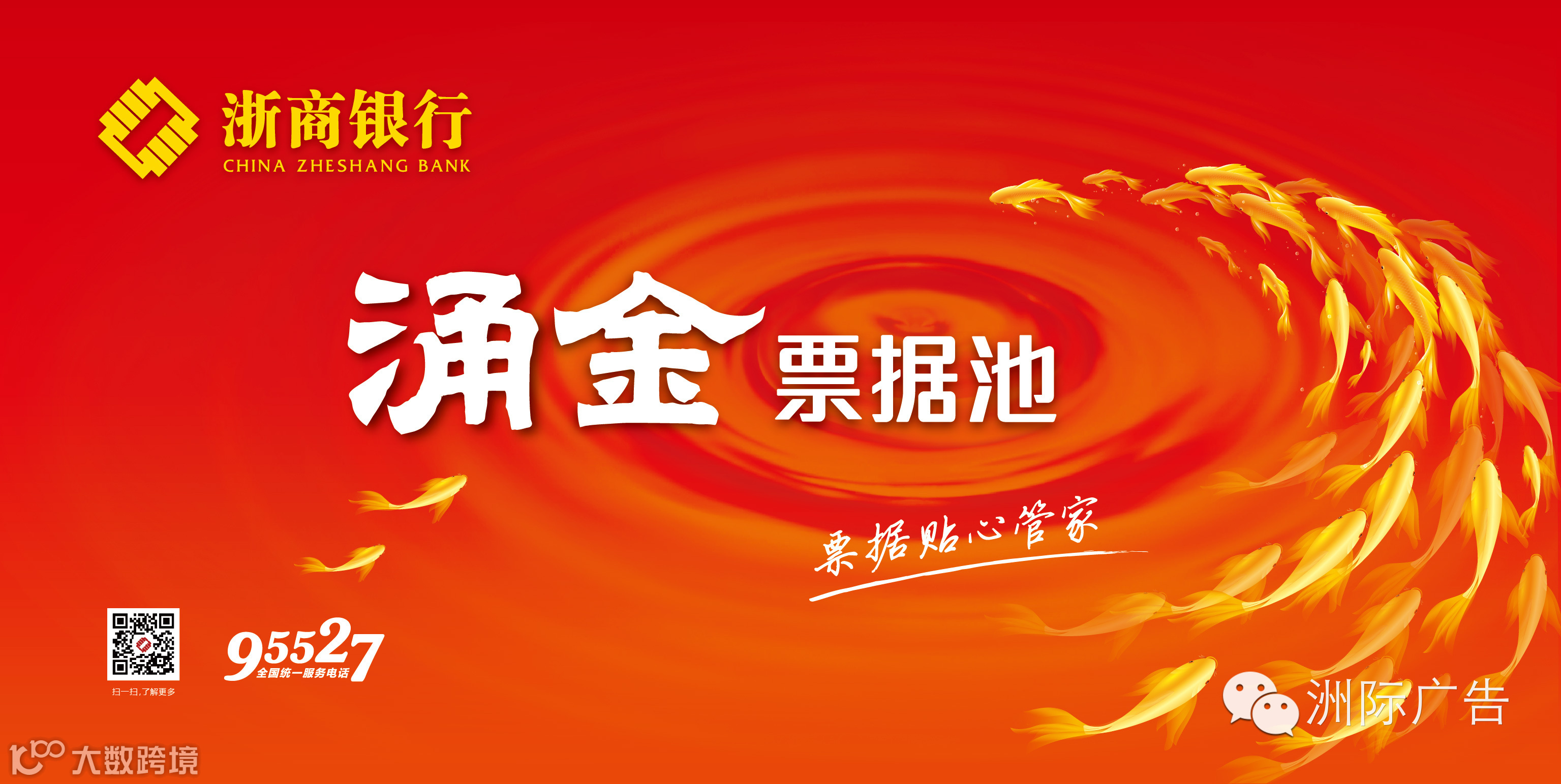 根据“涌金”票据池名称以及业务性质名,以池塘和锦鲤作为主画面元素,鱼也象征着“年年有余”的好彩头,设计师一笔一画勾勒出的锦鲤,动感逼真,锦鲤不断涌入画面,寓意着财富源源不断,与“涌金票据池”完美呼应。本次设计依旧延续着“浙商银行”红黄两种颜色,统一品牌形象,增强品牌记忆度。