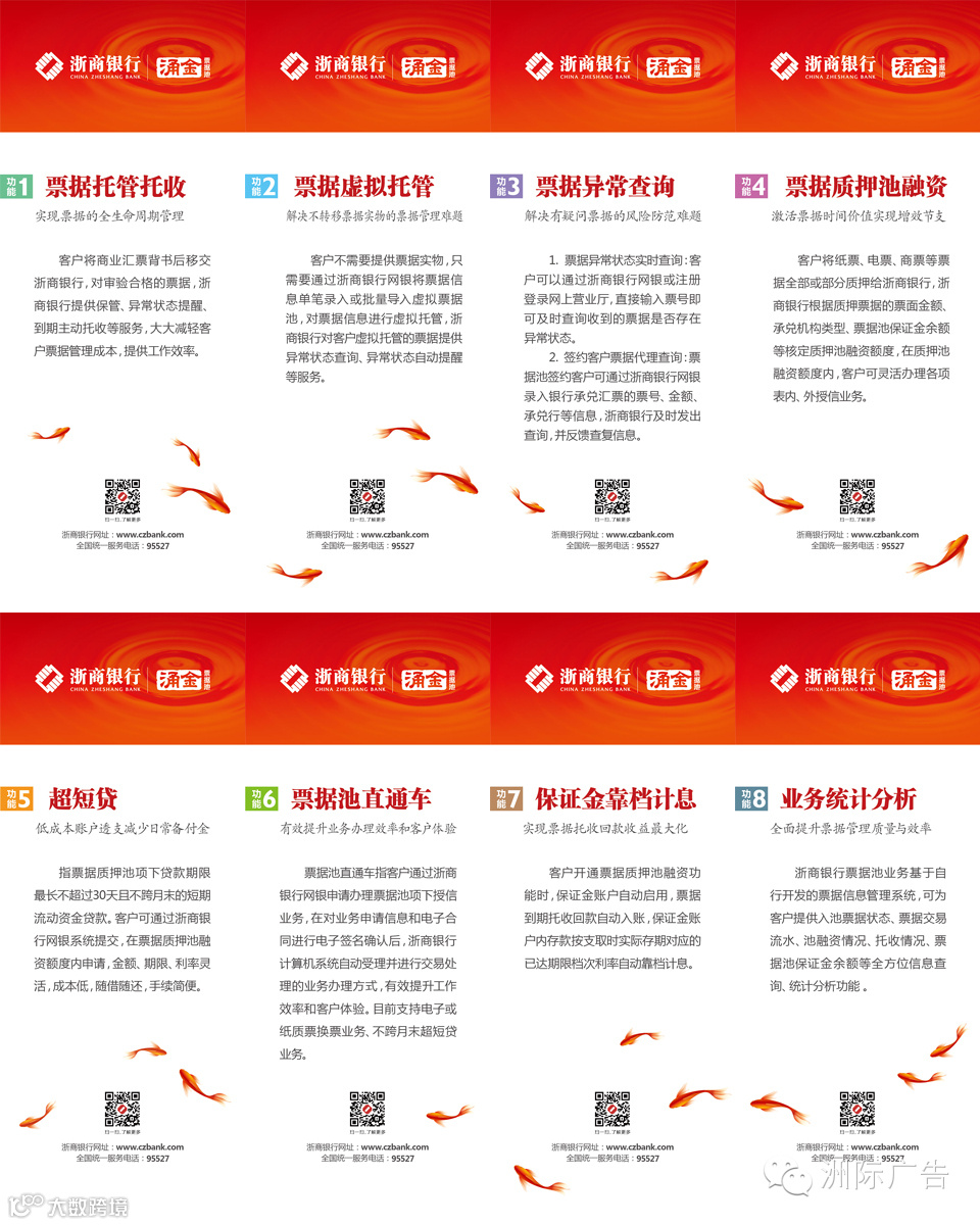 10月28日,浙商银行“涌金票据池”业务试运行半年后正式在全国19家分行同时推开。在此次业务推介会上,洲际广告为浙商银行“涌金票据池”提供了品牌形象设计。
