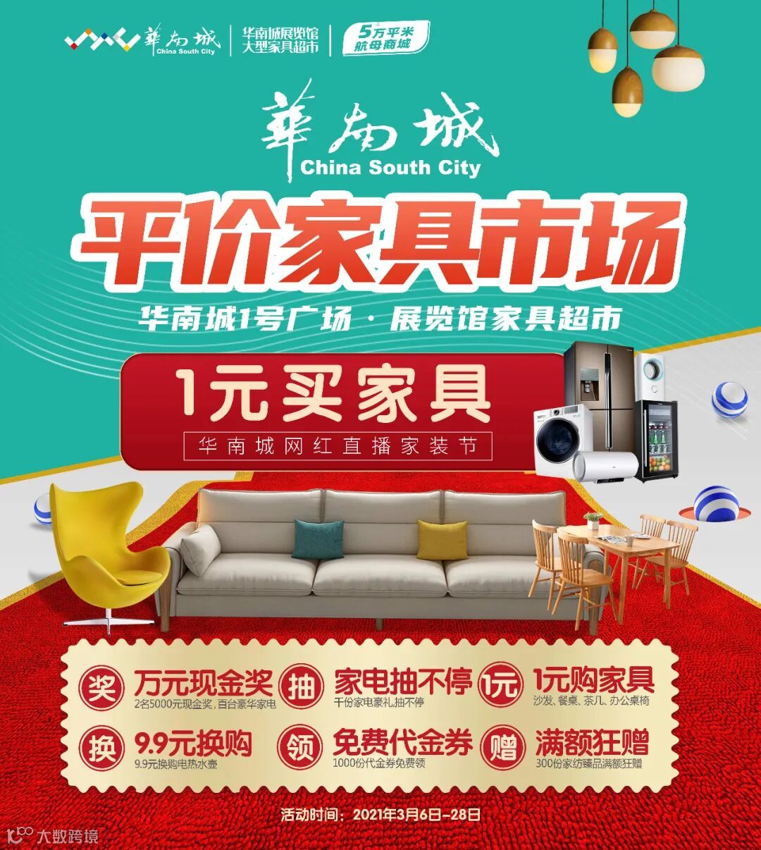 1、1元焕新家,千份豪礼免费送!南宁华南城春季家装盛宴开始啦!快来抢购吧!