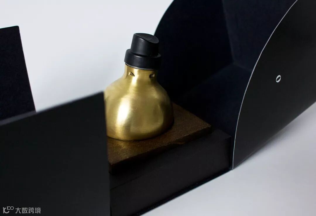 一种由门把手制成的奢华女士香水。这款酒瓶的奢华体现在于使用金色,黑色和白色以及有色木质底座。