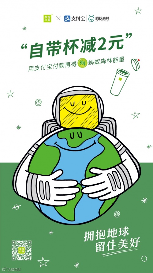 新式茶饮的头部品牌奈雪的茶,早在去年联合支付宝发起“自带杯减2元”活动,据其官方介绍,顾客到全国任意门店使用自带的杯子购买茶饮产品即可立减 2元,若通过支付宝付款还能再获得30g蚂蚁森林能量。