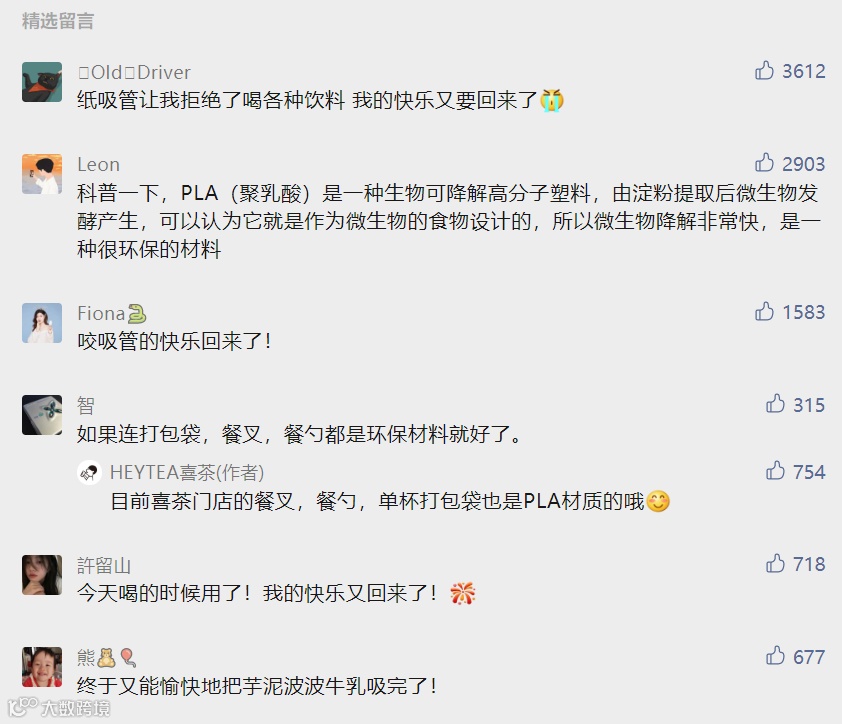 今年1月,喜茶宣布“被纸吸管剥夺的快乐回来了!”。喜茶用原创PLA可降解吸管代替纸吸管,增强了耐热性,兼顾环保与体验。