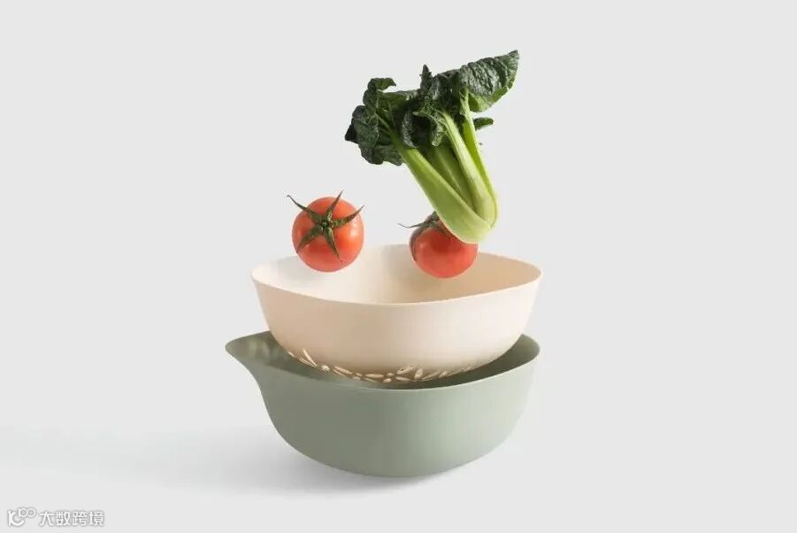 除了基础的食品饮料领域,在生活化的场景里,也有可以环保发展的空间。这款沥水篮的设计,就从材料角度进行了尝试。