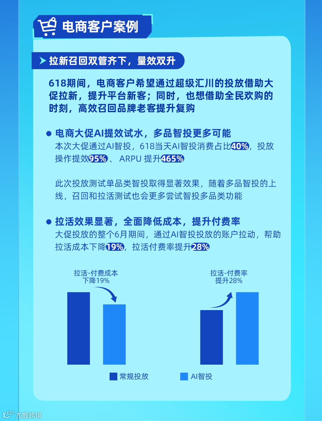 AI智投在今年的大促中发挥了关键作用。在某电商客户的案例中,618当天AI智投消费占比达到40%,投放操作提效95%,ARPU更是提升了465%。