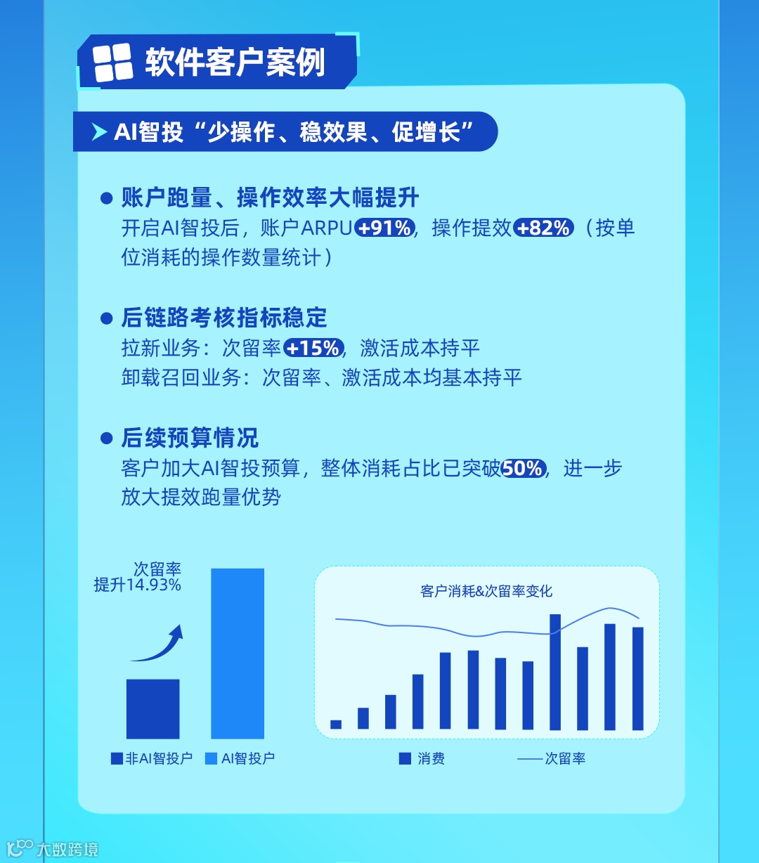 在软件客户案例中,AI智投模式通过智能化手段帮助客户实现了“少操作、稳效果、促增长”的目标。