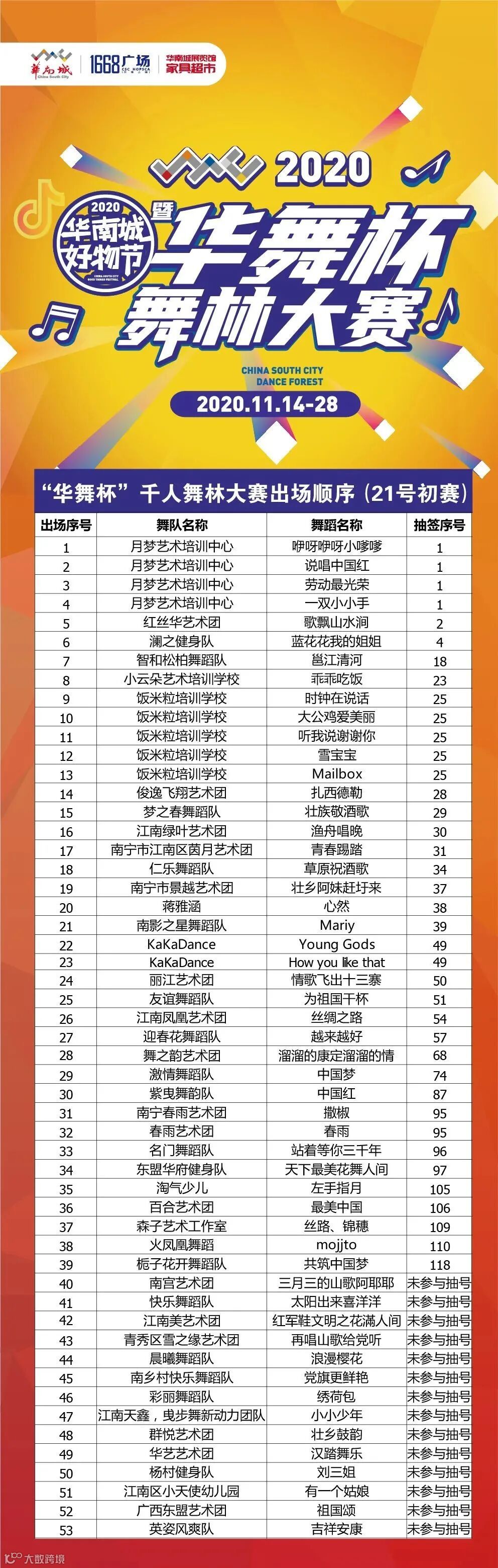 2、南宁华南城“华舞杯”千人舞林大赛(初赛)出场顺序已定,分两场PK,一决高下!