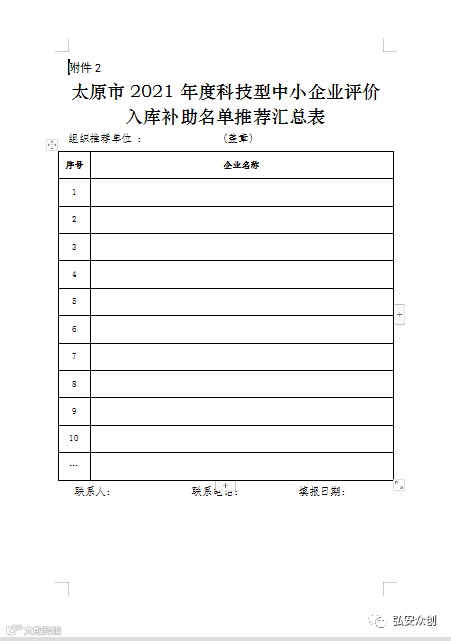 (二)各县(市、区)、综改区、中北高新区科技管理部门对申报材料进行形式审查,签署推荐意见并签字盖章,填写《太原市2021年度科技型中小企业评价入库补助名单推荐汇总表》(见附件2)并盖章。企业申报材料和汇总表各一式3份纸质材料,其中2份报送至太原技术转移促进中心,1份留存各县(市、区)、综改区、中北高新区科技管理部门备查。