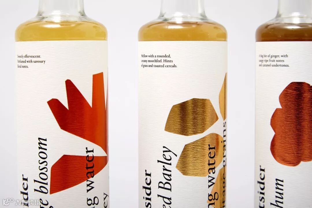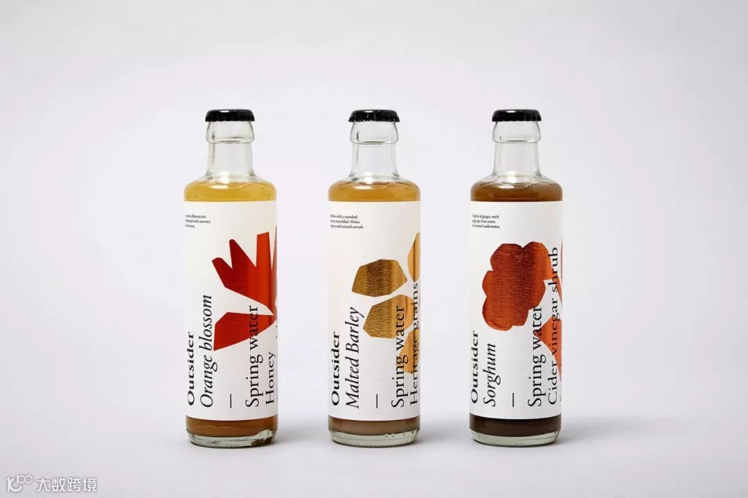 Outsiders的外包装上压印了金属色来表示内容物的植物成分,粗体字母垂直列出成分,简单明了。每个瓶子的顶部有一个简单的口味描述,以确保消费者购买到自己喜欢的味道。