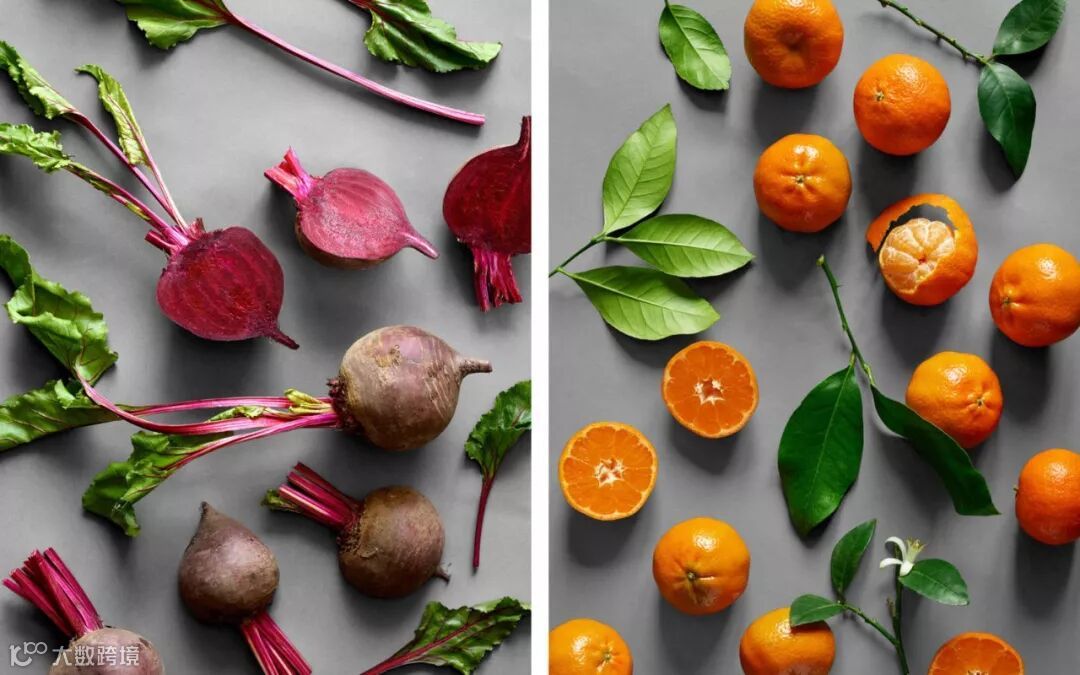 这款果汁包装用果蔬的剪影几何形状搭配鲜艳的色彩,由此引起人们的注意。