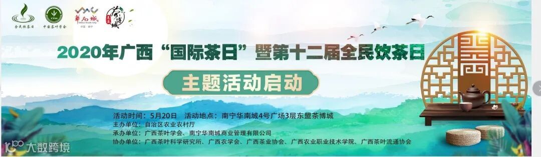 中国是茶叶的故乡,也是茶种植规模最大、产品种类最全、茶文化底蕴最深厚的国家。为推动中国同各国茶文化交流互动,促进茶产业高质量发展,自治区农业农村厅、广西茶叶学会联合南宁华南城商业管理有限公司组织开展2020年广西“国际茶日暨第十二届全民饮茶日”“泡好一杯茶、茶香溢满城”活动,倡导“茶为国饮”,普及茶知识,弘扬茶文化,营造“知茶、爱茶、饮茶”的氛围,弘扬“廉、美、和、敬”的中国茶德思想。