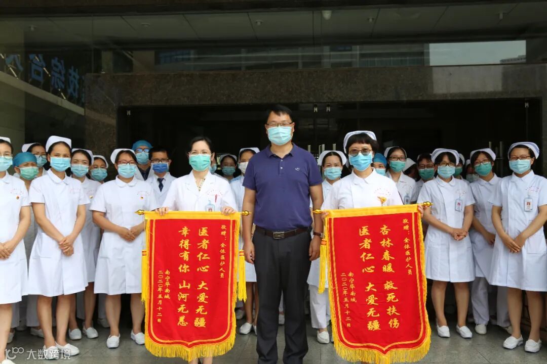 王少雄向护理部主任汪莉、援鄂医疗队队长施维赠送锦旗