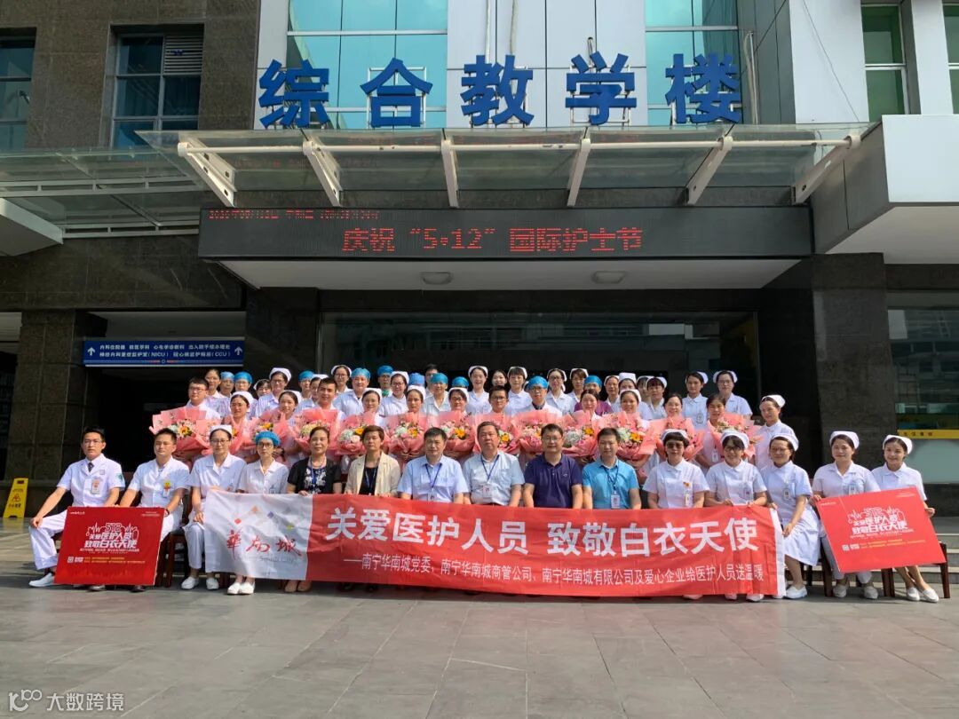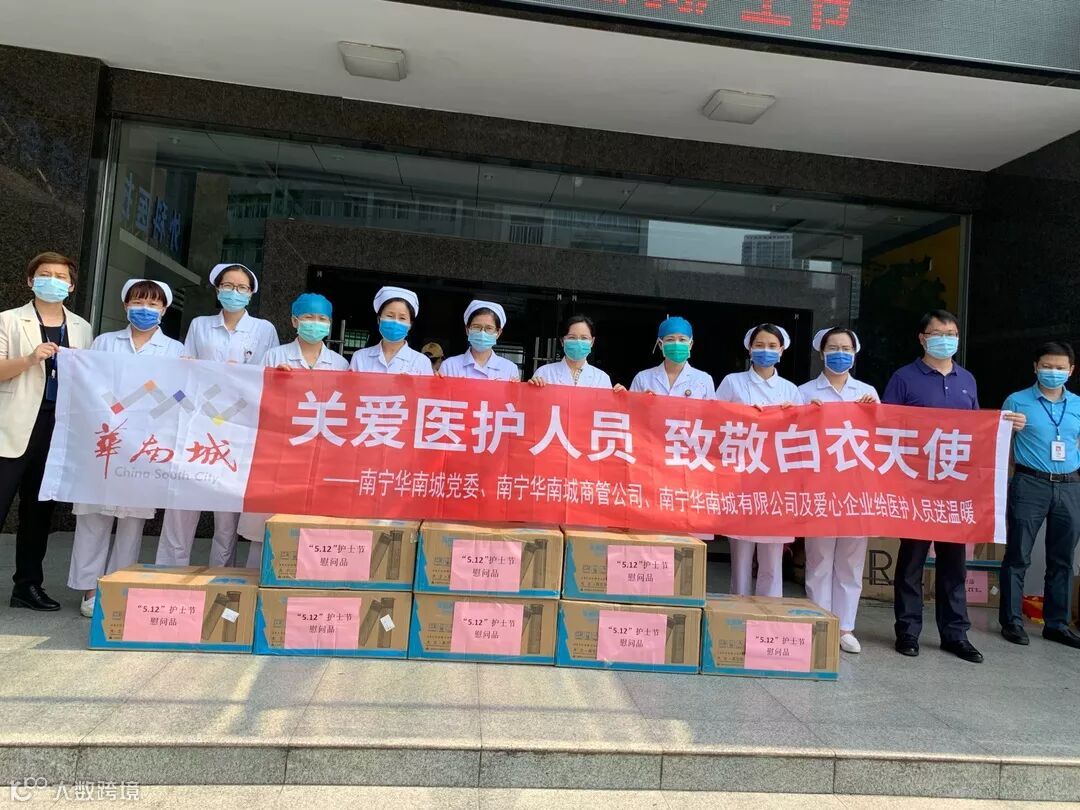 云霞开锦绣、万物启芳华!在这阳光明媚,生机盎然的美好季节里,又迎来了一年一度的“5.12”国际护士节,为感谢南宁市第二人民医院对广大市民提供的医疗服务,也为在抗击新冠肺炎疫情做出巨大贡献的医护人员表示深切的感谢,南宁华南城党委、南宁华南城有限公司、南宁华南城商业管理有限公司以“关爱医护人员,致敬白衣天使”为主题,对南宁市第二人民医院支援武汉新冠肺炎疫情的13名医务人员和1050名医护人员进行物资捐赠及爱心慰问活动,对所有白衣天使致以节日的问候和崇高的敬意。
