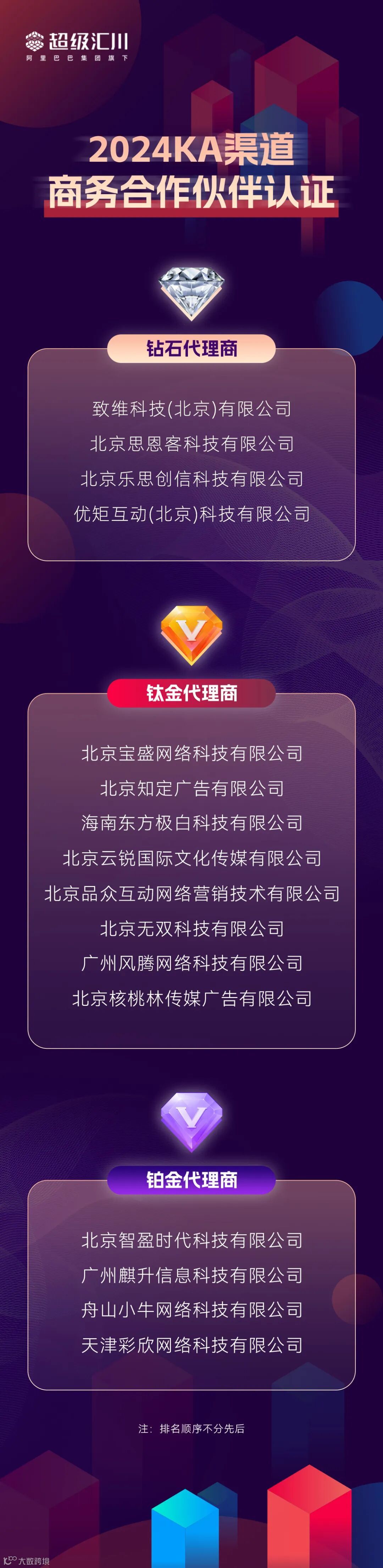 在这次KA年度代理商大会上,超级汇川广告平台也综合合作伙伴的业绩表现、项目贡献、拓展贡献、风控情况四个维度,评选出钻石代理商、钛金代理商及铂金代理商。