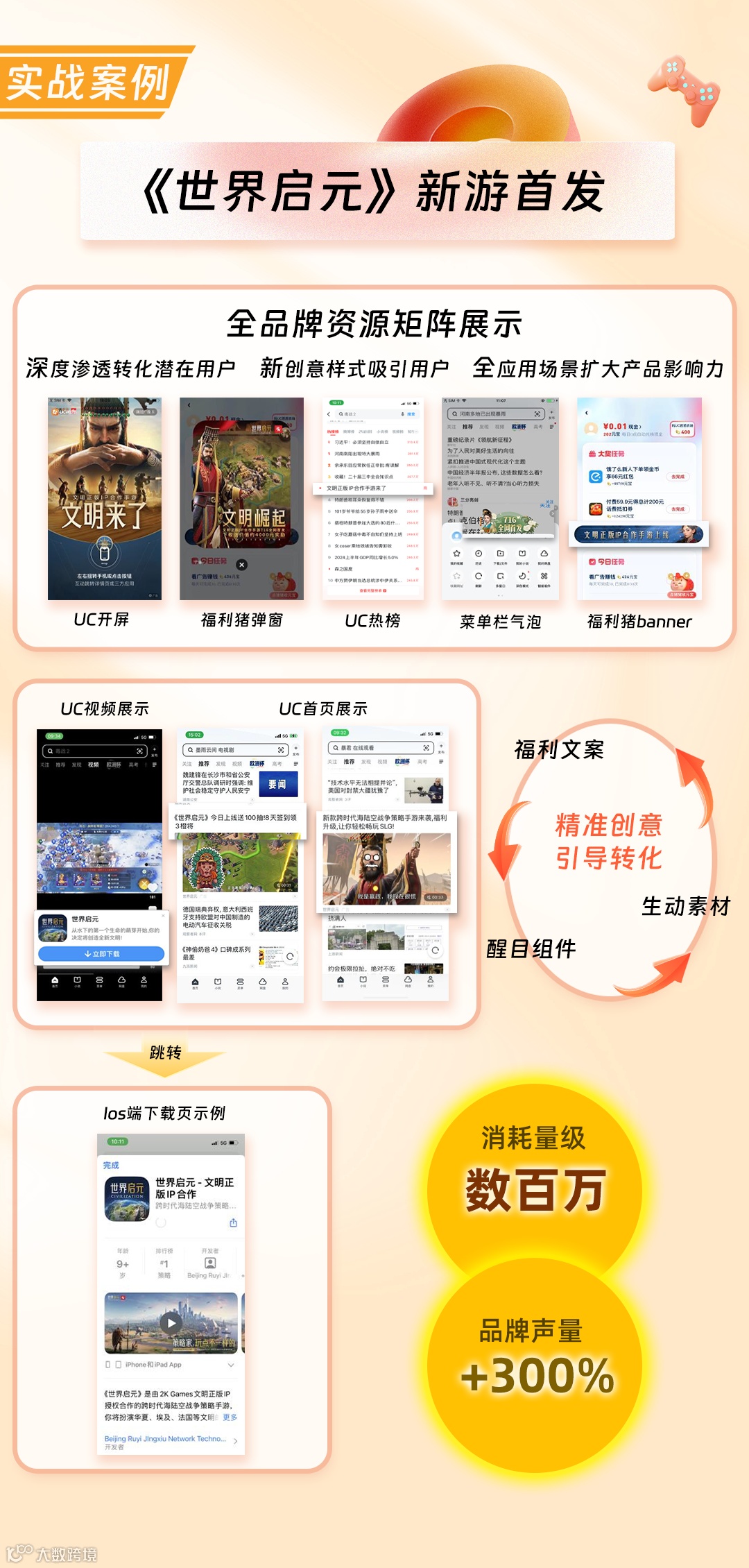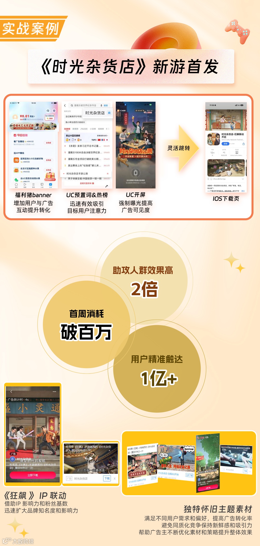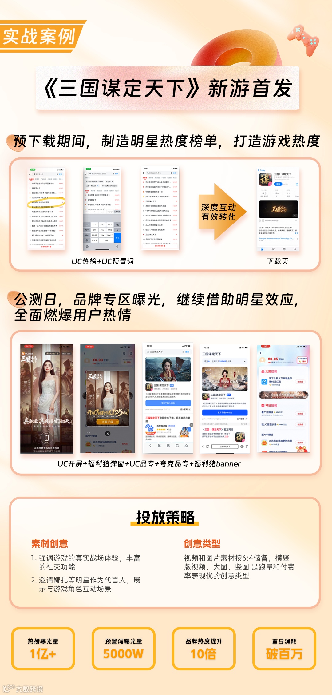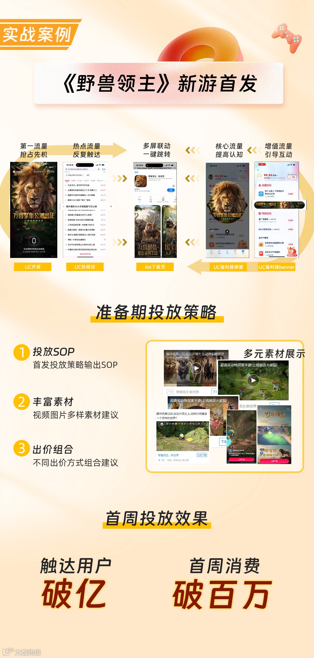 面对起量难、获客遇瓶颈等痛点,超级汇川“全、深 、新”三管齐下助力世界启元、三国谋定天下、野兽领主等打爆新游。借助明星效应、热度榜单等方式,以及UC开屏、福利猪banner、UC热榜等品牌资源矩阵,全应用场景曝光新游,深度点爆用户热情;同时叠加新颖精准创意样式、多元投放组合策略,引导潜在用户转化 ,成功助力多个SLG模拟游戏高效首发。