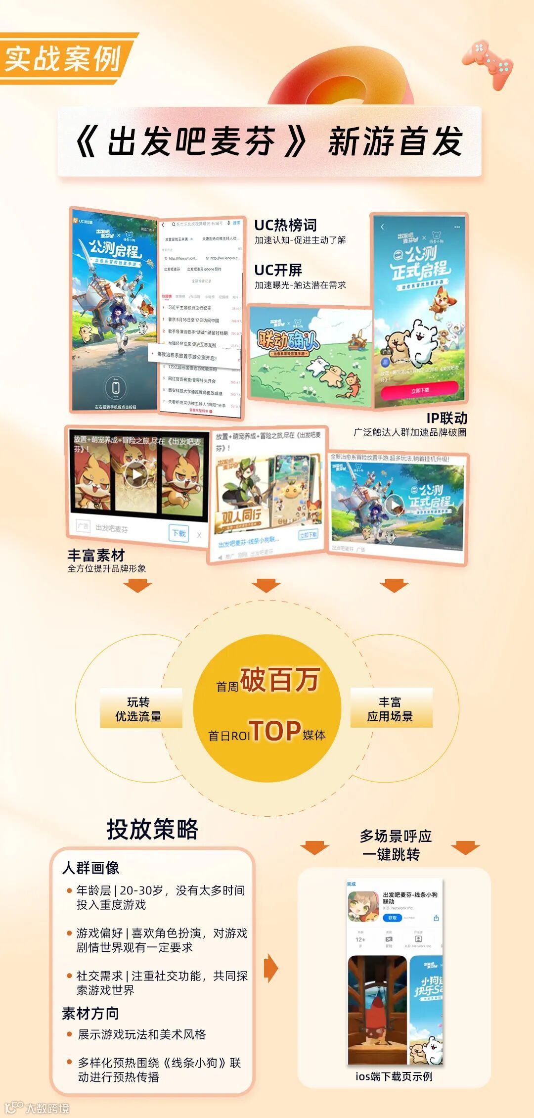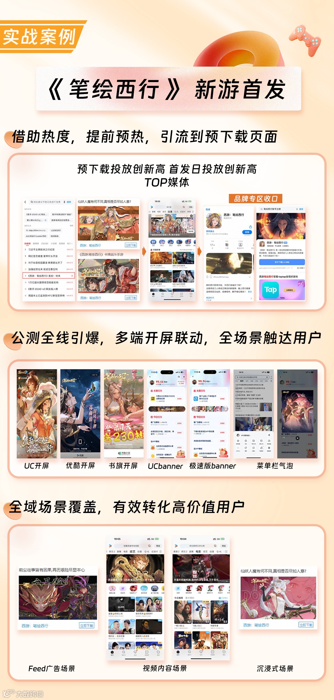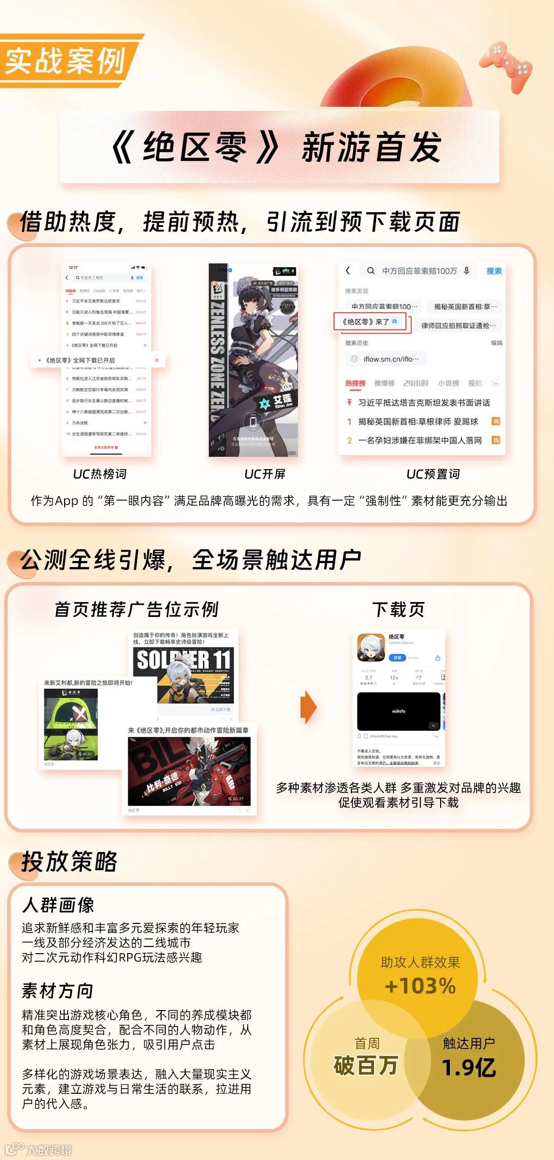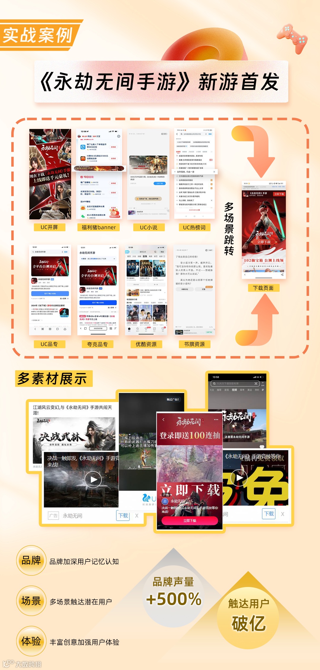 面对起量难、获客遇瓶颈等痛点,超级汇川“全、深 、新”三管齐下助力世界启元、三国谋定天下、野兽领主等打爆新游。借助明星效应、热度榜单等方式,以及UC开屏、福利猪banner、UC热榜等品牌资源矩阵,全应用场景曝光新游,深度点爆用户热情;同时叠加新颖精准创意样式、多元投放组合策略,引导潜在用户转化 ,成功助力多个SLG模拟游戏高效首发。
