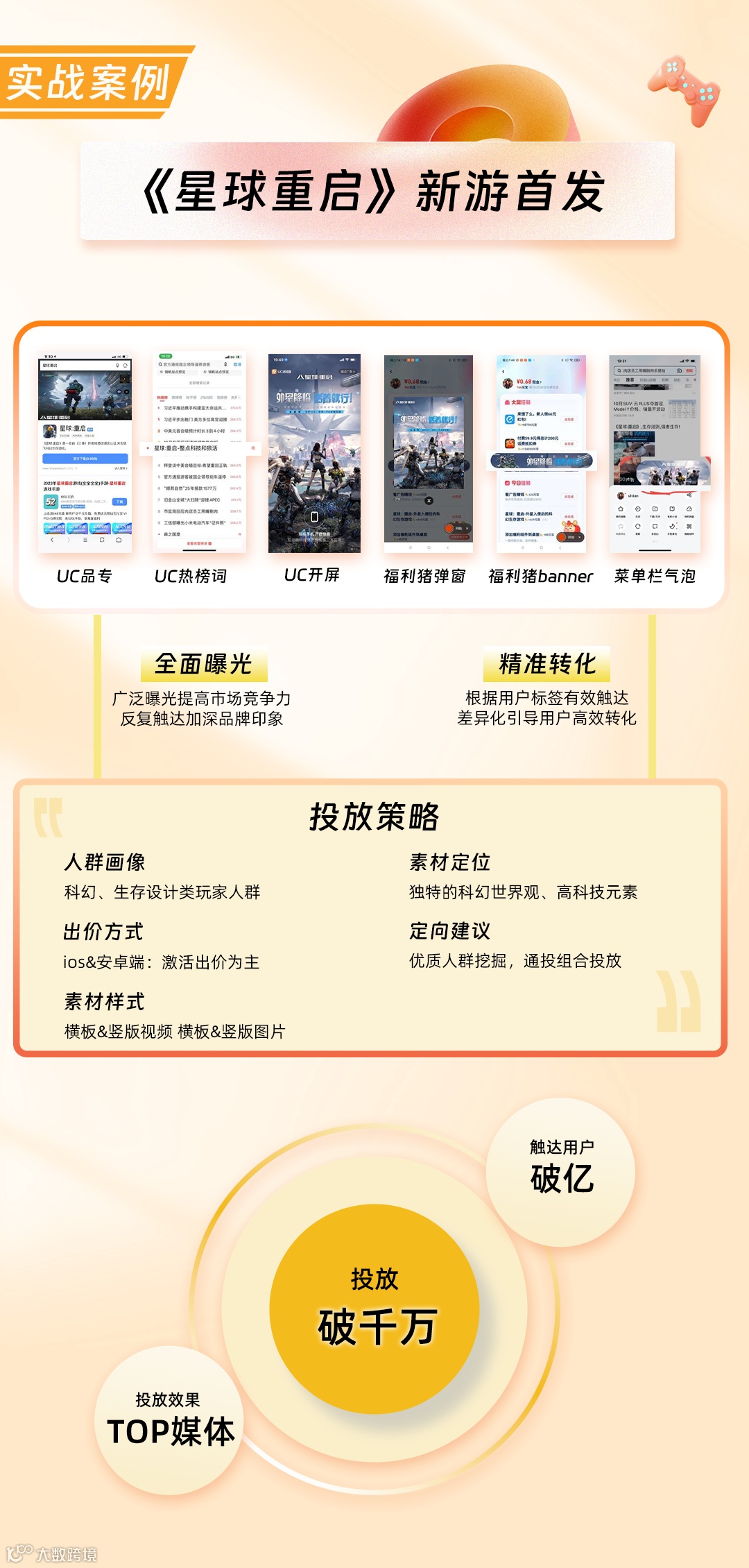 在超级汇川全域广告资源助力下,永劫无间手游通过“品牌+场景+体验”三轮驱动触达用户破亿,并以丰富创意素材强化用户体验感;星球重启则以UC品专、UC热榜词、UC开屏全面曝光加深品牌印象,同时瞄定“科幻、生存射击类玩家人群”目标客群精准转化的首发策略,在触达用户破亿的基础上高效流转。