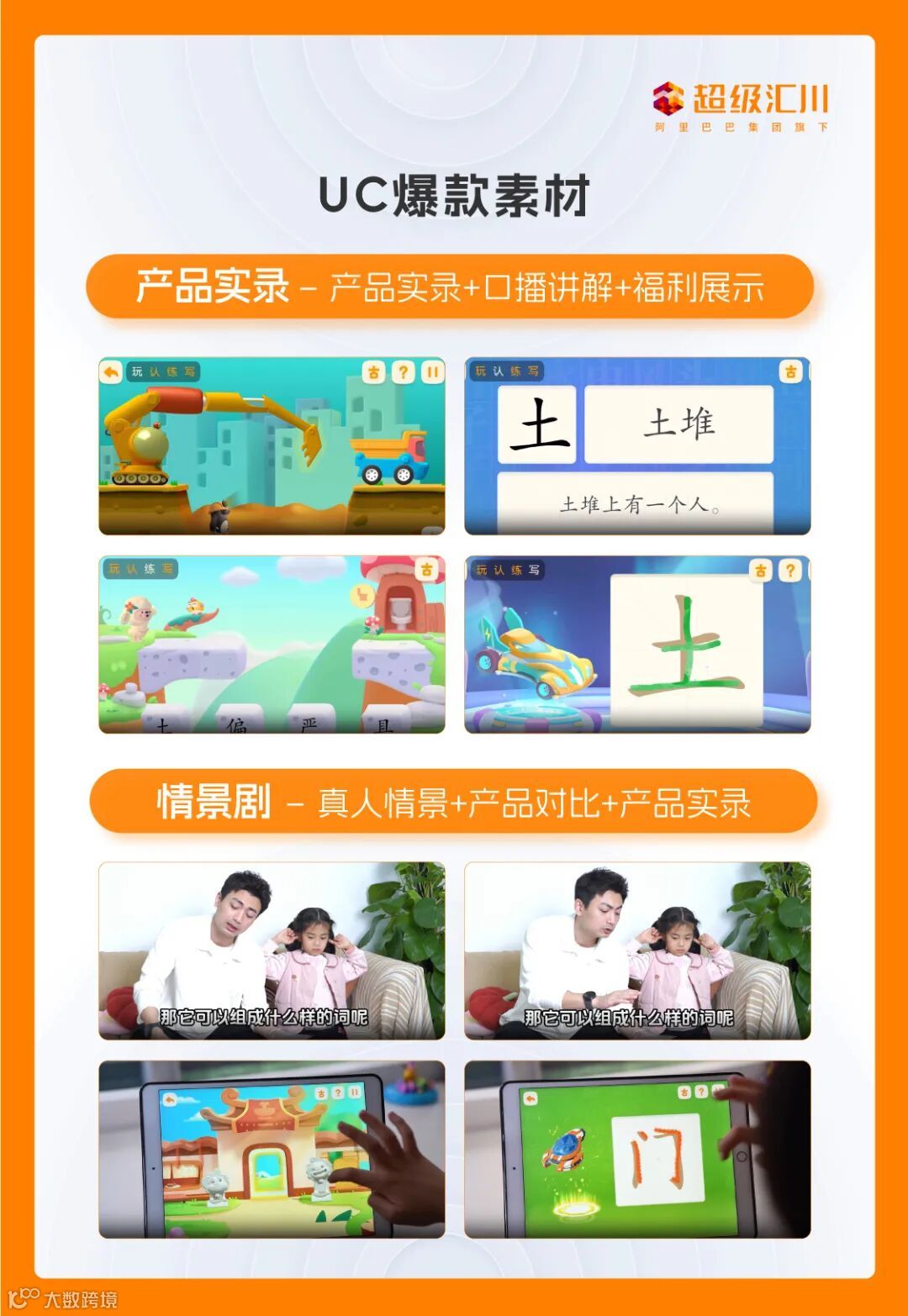 超级汇川爆款素材案例针对产品实录类的调优策略是通过产品课程录屏,全面展示玩、认、练、写,全方面讲解课程优势,吸引用户下载。