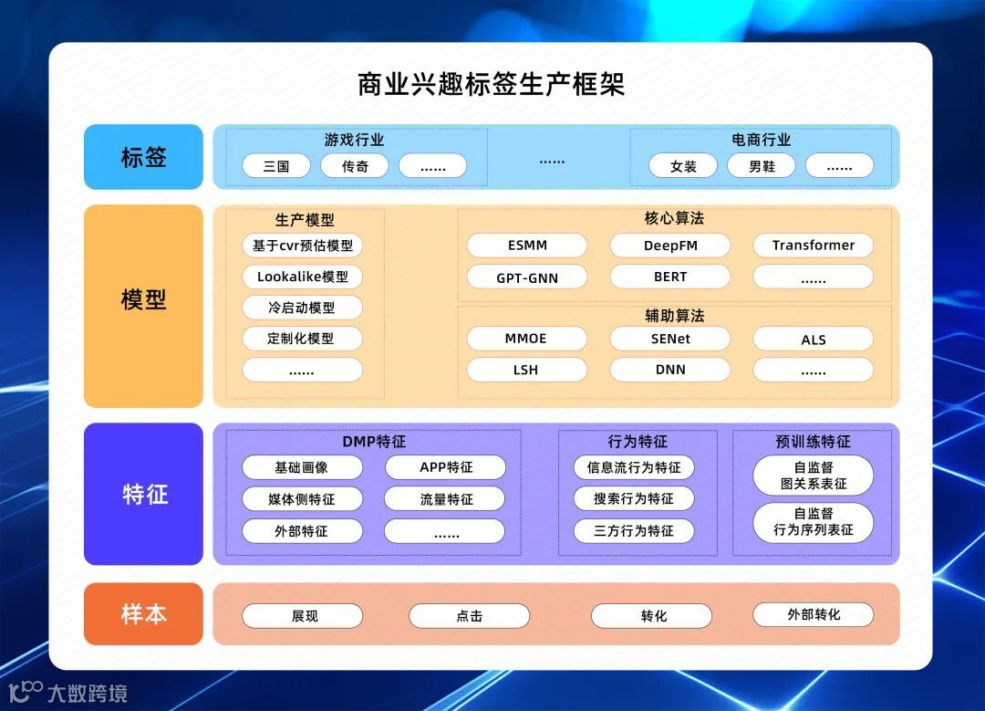 如上面框架,通过多种生产模型,给用户打上商业兴趣标签,具体详情如下: