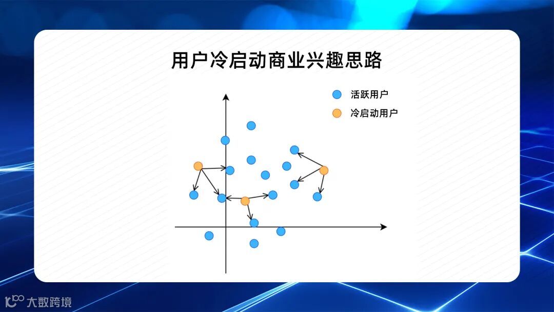 2. 向量空间中,每个冷启动用户,通过计算与活跃用户向量之间的距离,选择距离自己最近的n个活跃用户,将这n个活跃用户身上的top m个高频标签传递给自己,作为冷启动用户的商业兴趣标签。
