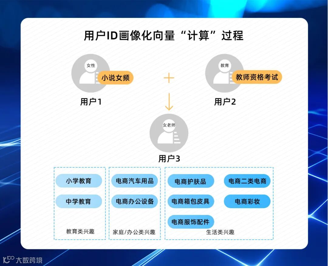 从用户3的商业兴趣标签来看,用户3身份可能是一位女老师,比较关注教育问题,偏好购买个人护理等生活用品,以及出行/办公相关用品。通过上述验证过程,“小说女频”兴趣的用户(女性)与“教师资格考试”兴趣的用户(教育)“相加”,得到的是一位与“女老师”角色相关的兴趣的用户。即不同用户兴趣之间的“计算”结果,表达了不同兴趣之间隐含的相关关系。