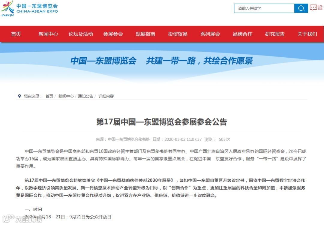 3月2日,东博会秘书处发布第17届中国—东盟博览会参展参会公告称,第17届东博会将于2020年9月18-21日在南宁举行,9月21日为公众开放日。