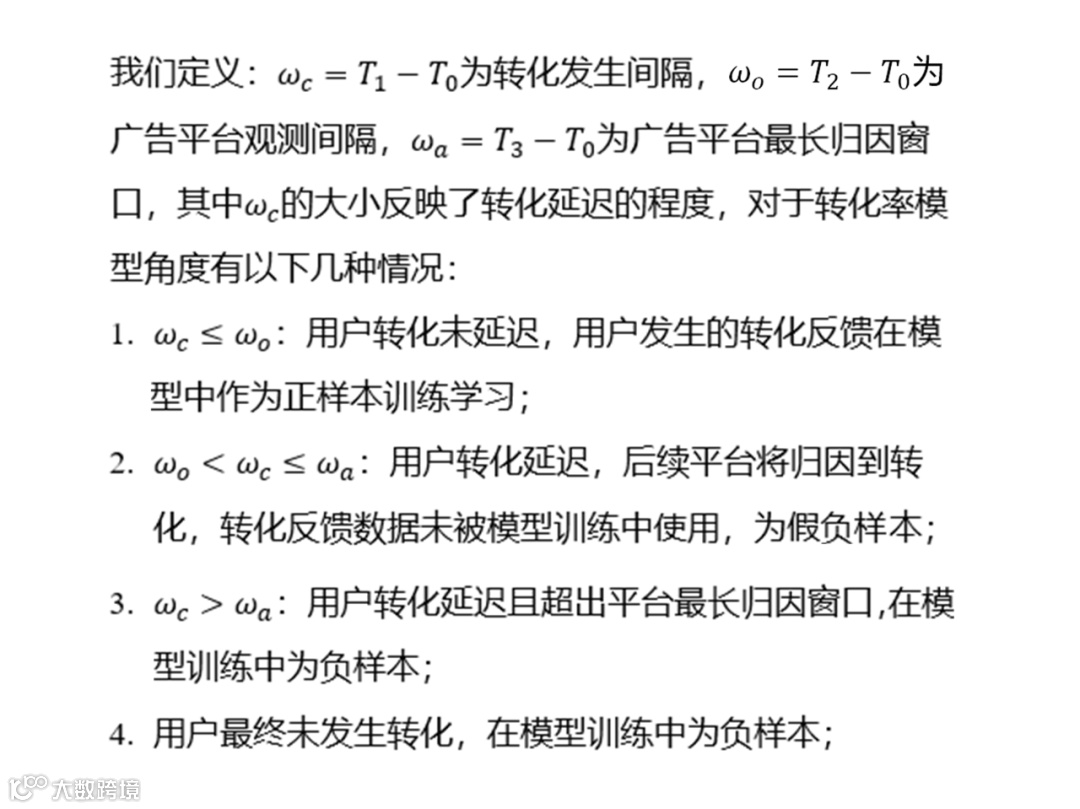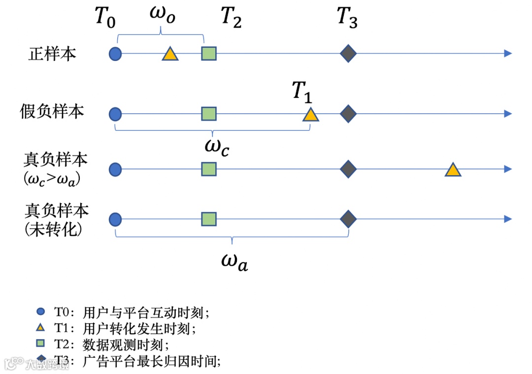 从一次用户广告浏览开始举例,用户可能对该广告感兴趣从而点击广告,在页面中下载APP;用户可能在若干小时后才进行APP的激活和注册,而付费行为则更可能发生在一天或多天之后。用户与广告媒体交互到后链路转化发生的时间差异,我们称之为转化延迟时间。转化延迟的分布跟用户行为习惯有关,也跟广告后端业务流程有关。一般地,转化行为链路越深,转化延迟越大,但是不同的行业、不同的广告业务实体其延迟率又存在差异,因此转化延迟的分布是一个非常复杂的数学模型。在考虑转化延迟的情况下,转化率预估模型的样本逻辑变得非常复杂: