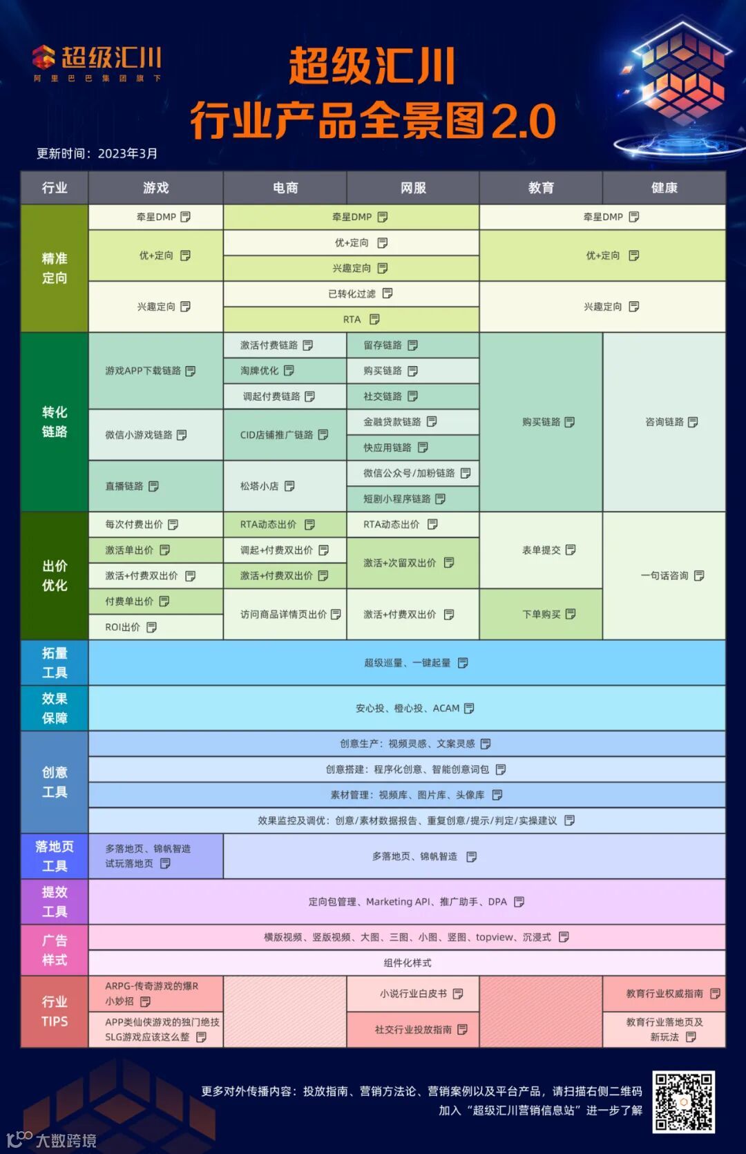 超级汇川广告平台“行业产品解决方案大图”全新升级2.0版本,通过这一份全景图,纵向从投放的各个环节做目标展开,横向细分不同的营销行业,为各行业的广告主和优化师们提供投放细分节点上的营销工具指南。
